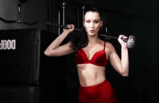 Hadid, elinde balyoz ile bir tekerleği parçalarken poz verdi.