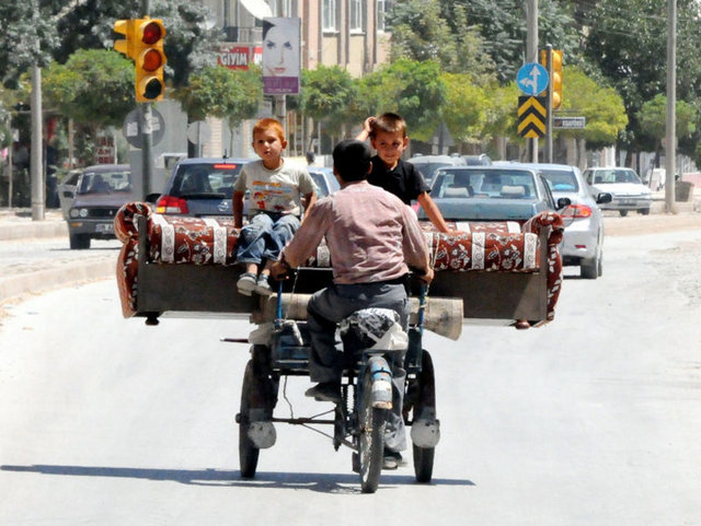 Üç tekerlekli bisiklette taşıdığı kanepenin üstüne çocuklarını oturtan bir baba objektife böyle yansıdı