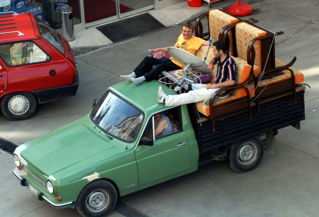 Samsun’da komyonet ile yeni aldıkları koltuk takımını taşıyan kişiler kamyonette koltuk takımına oturarak gitmeyi tercih ettiler